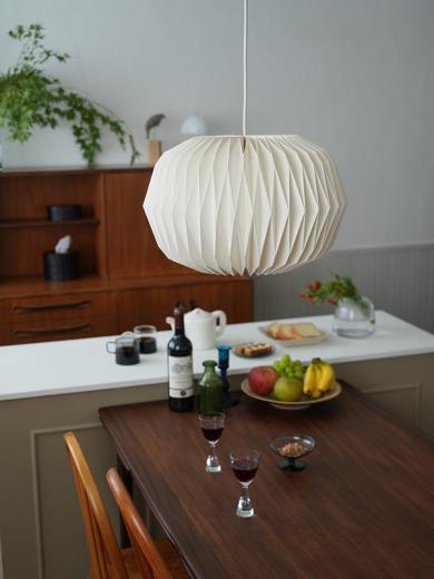 モーネシリーズは紙を手で折り上げて、幾何学的なフォルムに仕立てたペンダントシェードです。オフホワイトがかった白色の紙シェードは、見た目や手触りはしっかりしながらも独特の温もり感があります。軽くて割れない素材なので、ダイニング・リビング・寝室など様々な場所でお使い頂けます。